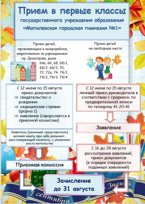 ГРАФИК приема документов для зачисления в 1 класс от родителей (законных представителей) детей, проживающих в микрорайоне государственного учреждения образования «Могилевская городская гимназия №1» (проспект Димитрова, дома 64а, 66, 68, 68/1, 68/2, 68/3, 70, 72, 72а, 74, 74/1, 74/2, 74/3, 74/4) с 12 июня по 15 августа 2026 года
